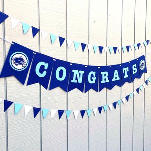 This large navy, white, and light blue "Congrats" graduation banner with two matching 6-foot pennant garlands is perfect for a Columbia, Yale, or Chapel Hill graduate. Personalize the sign by adding a name. This banner and garland set covers a lot of space and add a large splash of color.