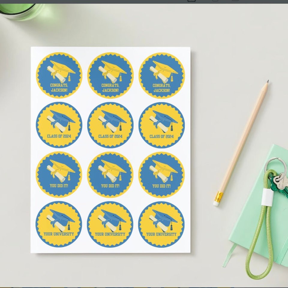 Edit these UCLA blue and golden yellow graduation cupcake toppers yourself in a free account on Canva (www.canva.com). Simply add your student's name, school, and year of graduation so you can print and finish them up for your party.