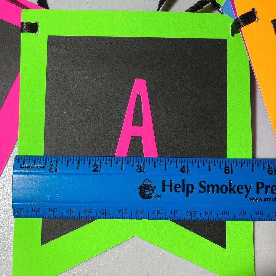 Each pennant backed in a neon color and inlayed with a black pennant and neon letter.