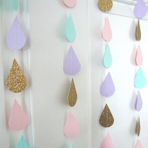 These mint green, blush pink, and lavender paper raindrop garlands interspersed with sparkly glitter drops will look so elegant at your friend’s or family member’s baby shower or baby sprinkle. Hang them as a backdrop behind the food table or gift table. Or use them to decorate the entry way to the party. You can even hang them from the edges of a suspended umbrella as a focal point.
