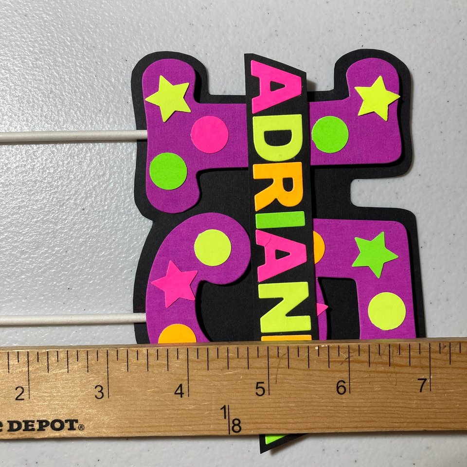 Neon colors that are available are green, orange, blue, pink, yellow, purple and reddish orange. The topper will be neon purple unless specified otherwise. Please enter the color you want for the number in the personalization box when checking out. If you have a specific request for the colors of the letters that spell out the name, please enter that information, as well.