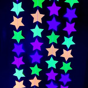 These neon paper star garlands fluoresce and glow like crazy under black light! You'll be amazed by these colorful strands and you'll love the way they light up your neon glow party. Hang shorter lengths dangling from the ceiling. String longer lengths vertically as a backdrop or horizontally across walls or ceiling. They will make your party guests ooo and ahhh!