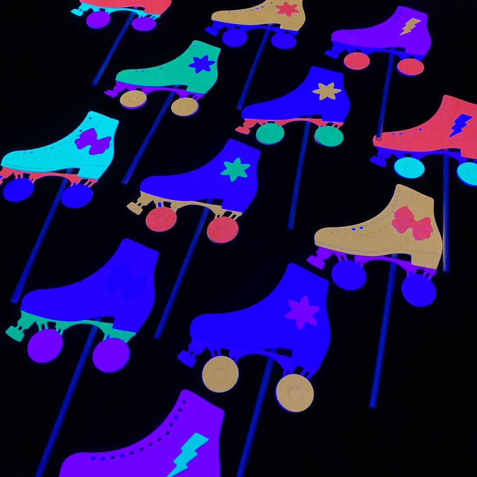 This is a set of 12 neon roller skate cupcake toppers that glow under black light. You will love the vibrant colors under regular light and the way they fluoresce and glow radiantly under black light. They are the perfect pop of color and touch of class to your child's skate birthday party or an 80s theme birthday celebration at a roller rink.